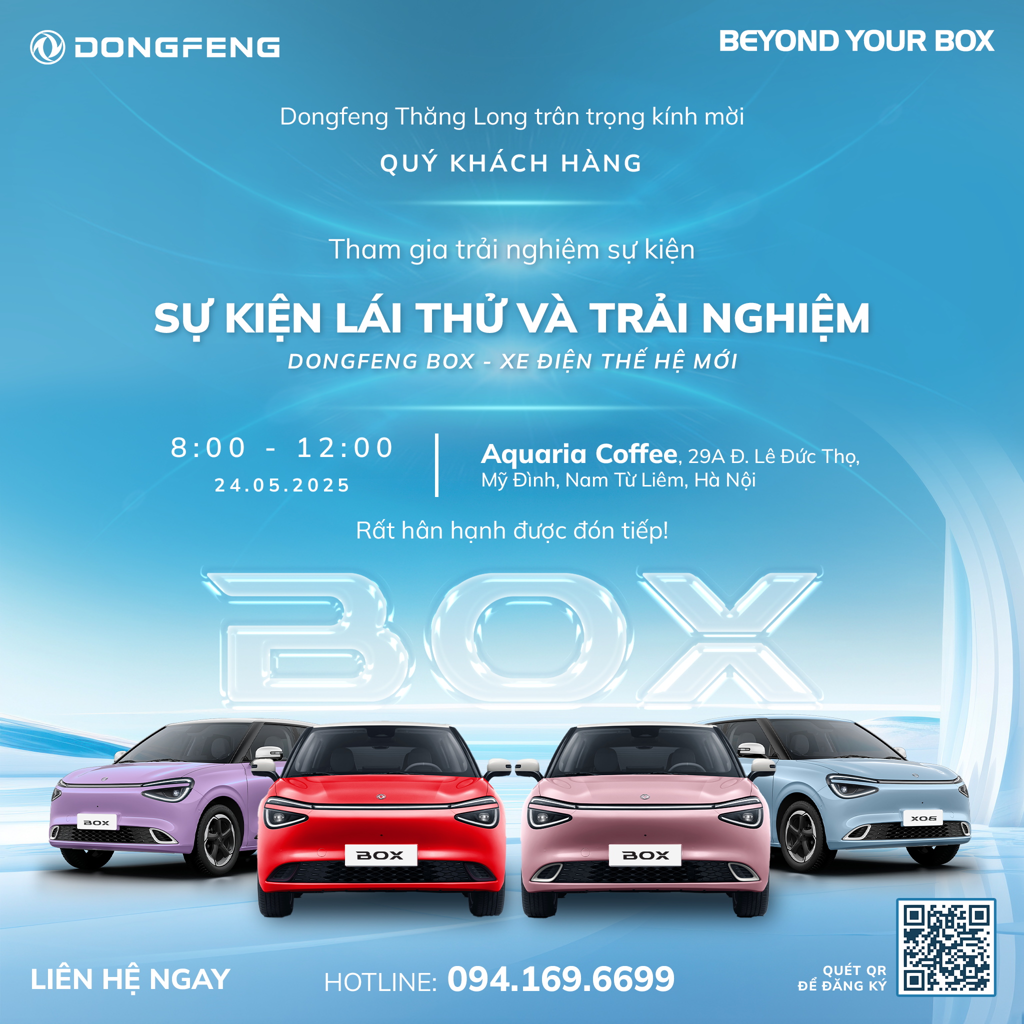 Thiết kế thời trang, công nghệ lái thông minh và khả năng vận hành bền bỉ giúp Dongfeng Box nhanh chóng trở thành lựa chọn yêu thích của người dùng đô thị hiện đại. Nhằm mang đến trải nghiệm thực tế cho khách hàng, Dongfeng Thăng Long trân trọng mời bạn tham gia sự kiện lái thử và trải nghiệm các dòng xe nổi bật trong hệ sinh thái xe điện Dongfeng.